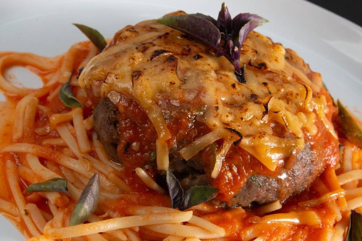 Opção 2 – Polpetone & Spaghetti (polpetone recheado com mussarela, acompanhado de spaghetti grano duro ao molho sugo artesanal)