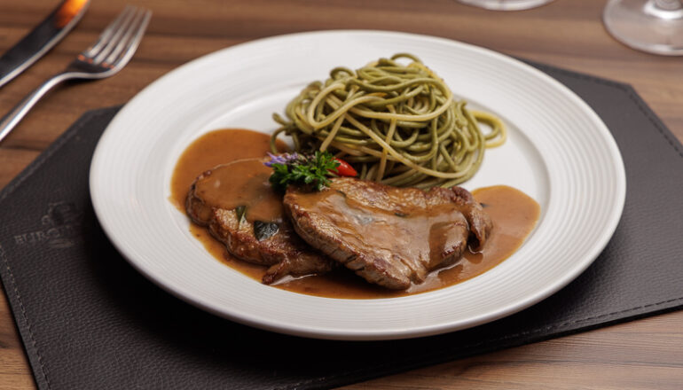 Escalopes de mignon ao molho roti e vinho branco, acompanhado de massa fina verde e branca na manteiga de sálvia. Prato servido no almoço, de terça a domingo, e no jantar, de terça a sábado, por R$ 89,90.