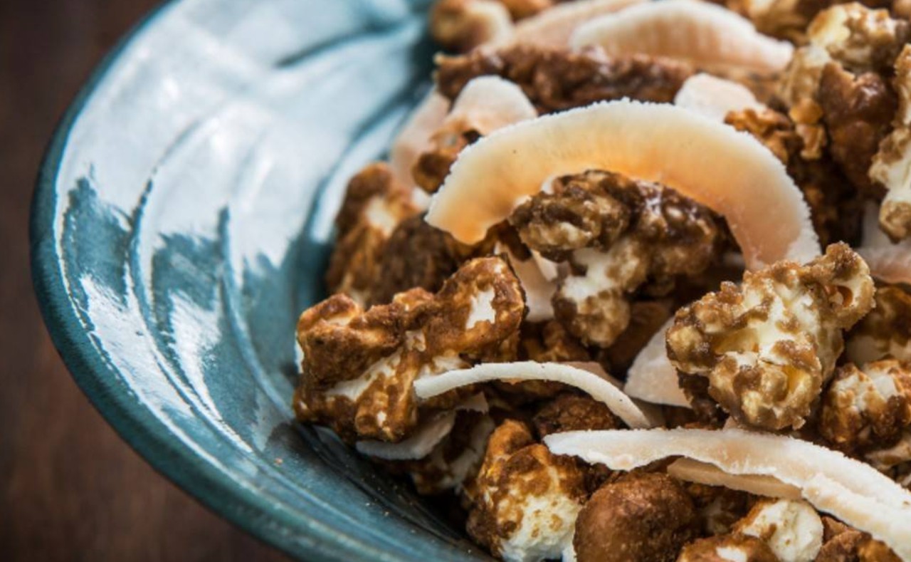Espalhe a pipoca sob um silpat ou papel manteiga e leve ao forno a 120°C por aproximadamente 30 min misturando a cada 15min.