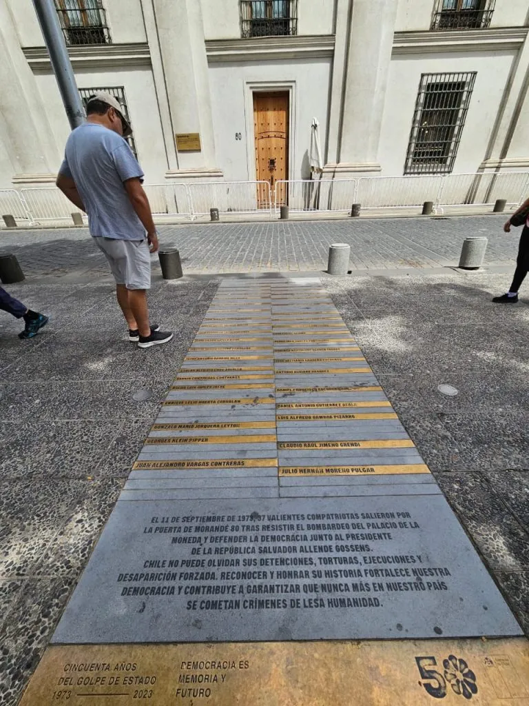 Dezenas de jovens idealistas, inconformados com o modo como o país foi conduzido nos meses recentes, foram vítimas de várias atrocidades. Seus nomes hoje estão gravados em placas que ajudam a formar a calçada em frente ao prédio, para eternizar a vergonha da violência que sangrou a democracia no Chile pouco tempo antes.