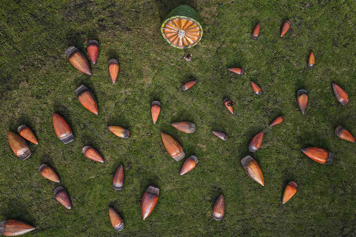 Esculturas de uma pinha e pinhões gigantes, feitas pelo artista Índio Artesão, são o grande diferencial do espaço. “Eles estão aqui para lembrar aos curitibinhas o nome da nossa cidade, que significa muito pinhão”, explicou o prefeito aos estudantes da Escola Municipal Joana Raksa, que foram conhecer o parque em primeira mão.