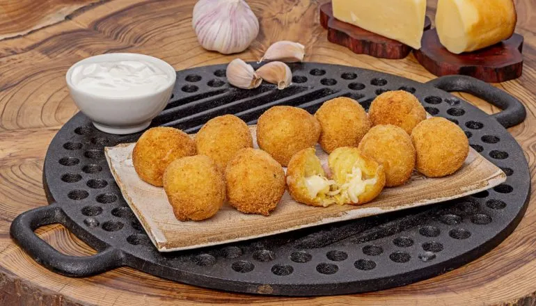 Porção de bolinhos recheados com queijo provolone. Acompanha maionese de alho da casa.