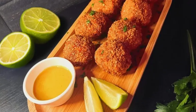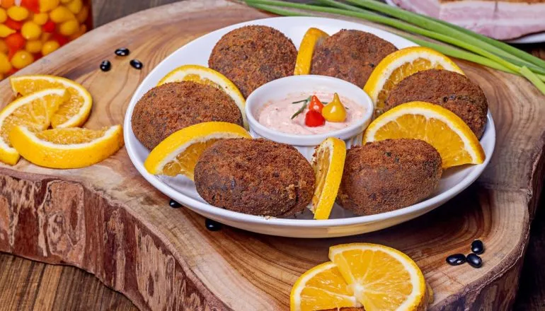 Porção de bolinho de linguiça tipo Blumenau recheado com queijo provolone e crosta de queijo, servido com limão e molho artesanal agridoce de pimenta biquinho.