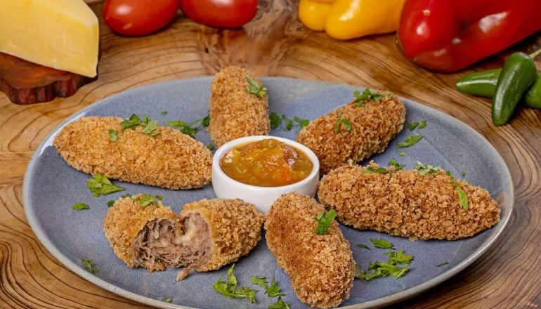Porção de bolinhos de cupim defumado e recheado com queijo muçarela, empanado na farinha Panko. Acompanha um molho de salsa da casa.