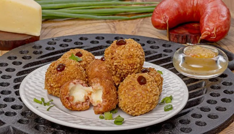 Porção de bolinhos de linguiça do tipo Blumenau, recheado com queijo muçarela e requeijão, empanado na farinha panko e frito. Acompanha molho artesanal agridoce de abacaxi com pimenta.