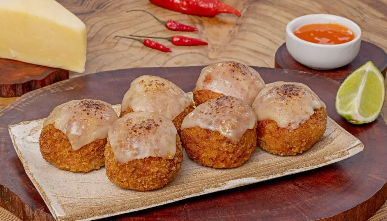 Porção de bolinhos elaborados com blend de carnes e temperos da casa, recheado com: pinhão, queijo muçarela, requeijão e cream cheese. Acompanha molho de pimenta cremosa, vinagrete, molho pesto vegano, molho de cenoura orgânica com queijo branco, todos artesanais.