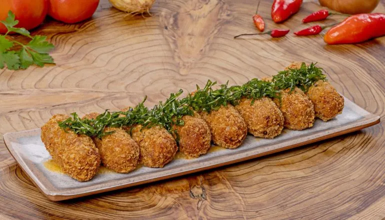 Porção de bolinhos – Arancini: bolinhos de risoto, temperados com salsinha e cebolinha, recheados com pastrami e queijo gorgonzola.