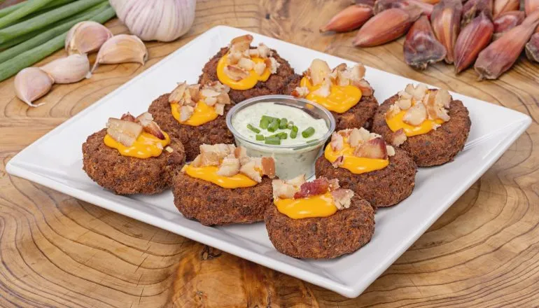 Porção de bolinhos de carne com cobertura de queijo cheddar e pinhão. Acompanha maionese verde de alho artesanal.