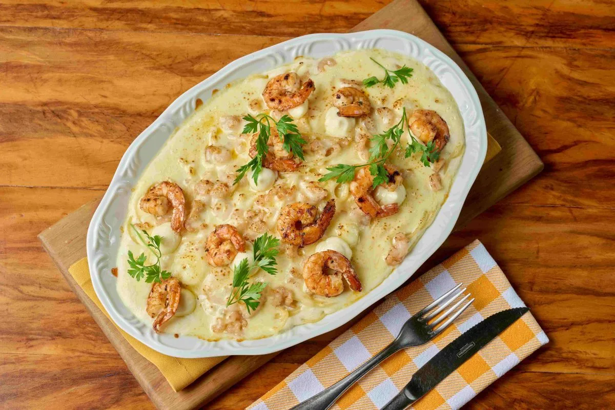 Para quem gosta de frutos do mar, uma boa opção é o Linguine com Camarão ao Molho de Catupiry, com deliciosos camarões flambados ao conhaque (R$ 161).