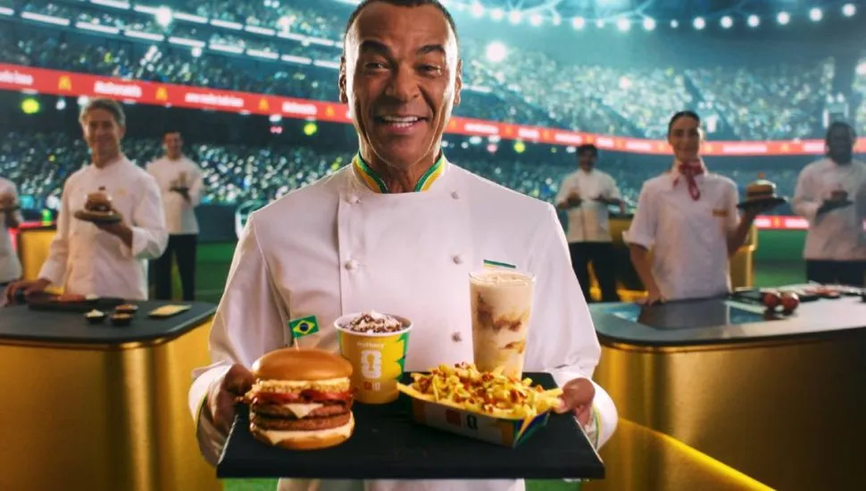 Imagem mostra o craque Cafu segurando uma bandeja com sanduiches do McDonald´s