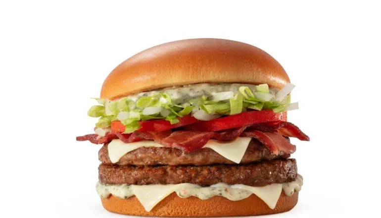Sanduíche feito com pão tipo brioche, dois hambúrgueres de carne 100% bovina, molho Ranch,  molho barbecue, bacon e queijo sabor cheddar.