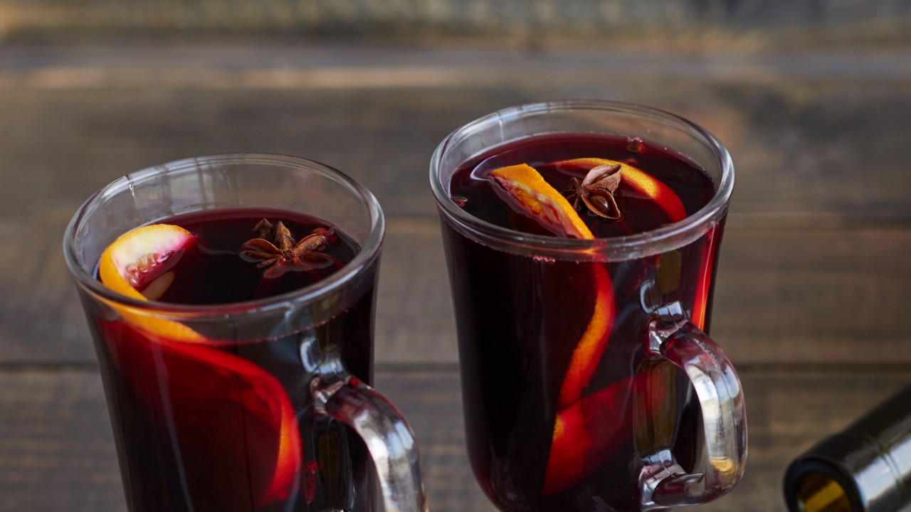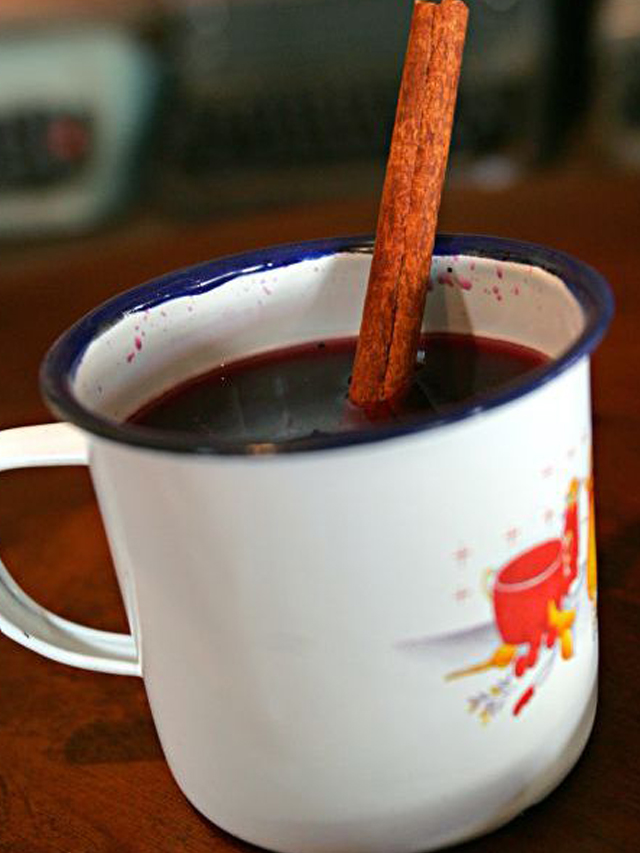 Junte todos os ingredientes, exceto o vinho, em um refratário e misture até dissolver o açúcar. Depois leve ao microondas por 3 minutos – cuidado na hora de retirar. Em seguida, coe tudo e adicione o vinho. Leve novamente ao microondas por 1 minuto, sirva em canecas e decore com rodelas de laranja.