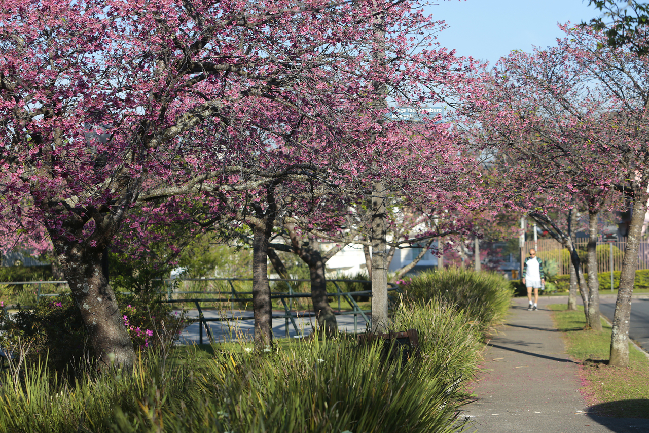 No Jardim das Américas, a Praça Tsunessaburo Makiguti tem sido um dos locais mais procurados para conferir o cenário cor-de-rosa. Há cerca de 70 cerejeiras por lá.