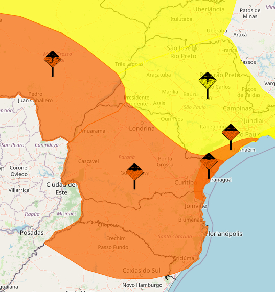 Os alertas emitidos pelo Inmet trazem risco de acumulados de chuva para Curitiba e região metropolitana. Segundo o órgão o nível de chuva pode ficar entre 30 e 60 mm por hora. É preciso ficar atento!
